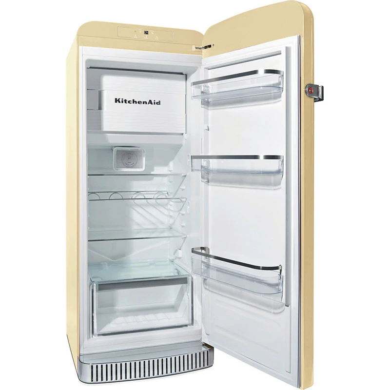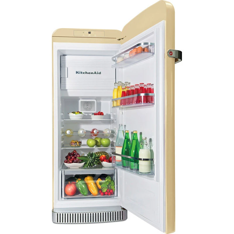 KitchenAid One Door Iconic Refrigerator Almond Creme 230L The A++ Iconic Fridge features details that make the difference, a metal door and top, chrome aluminium handle, the red medallion on the handle as a signature and metal insert on adjustable balconies.