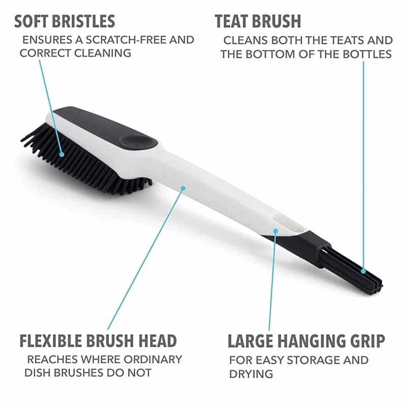 With Twistshake's dish brush, we ensure a thorough, scratch-free, and hygienic cleaning of your baby bottles, sippy cups, and teats. The brush's silicone bristles are soft and flexibly adapt to different bottle shapes, and the smart teat brush on the handle reaches deep into areas that regular dish brushes can't reach.\n\n- Smart Design: Integrated teat brush on handle\n- Safe Cleaning: Soft silicone bristles prevent scratches\n- Perfect Reach: Effectively cleans hard-to-reach areas\n- Comfortable Grip: Ergonomic handle with textured surface\n- Easy Care: Dishwasher safe
