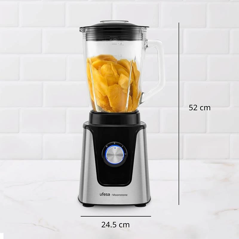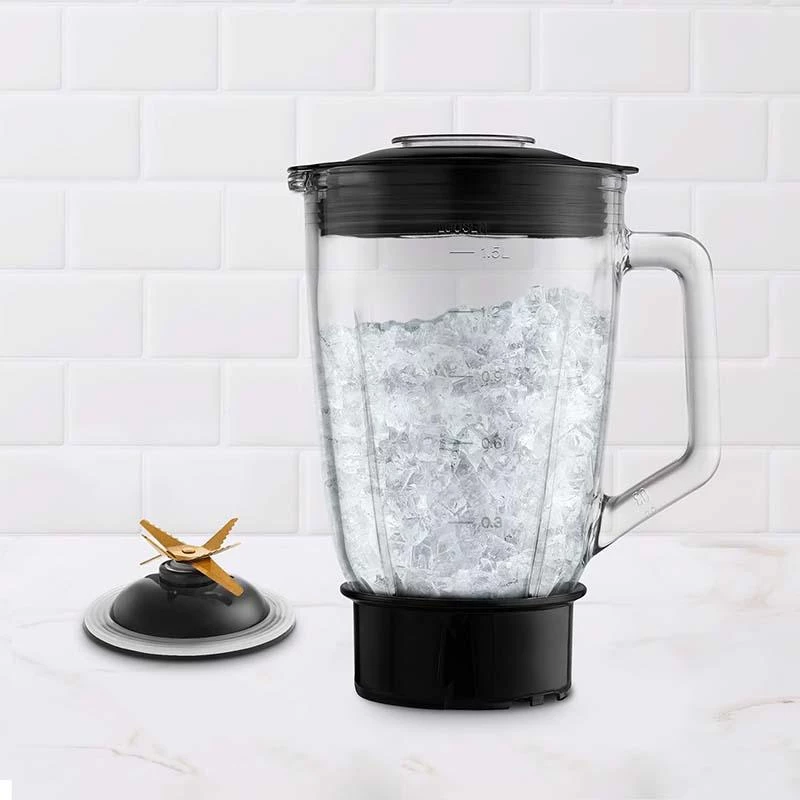Blender 1500W 1.5L glass jar Lid with window Speed control with LED light 2 speeds + Turbo 6 removable titanium blades suitable for crushing ice Safety lock Dishwasher safe jar Non-slip feet
