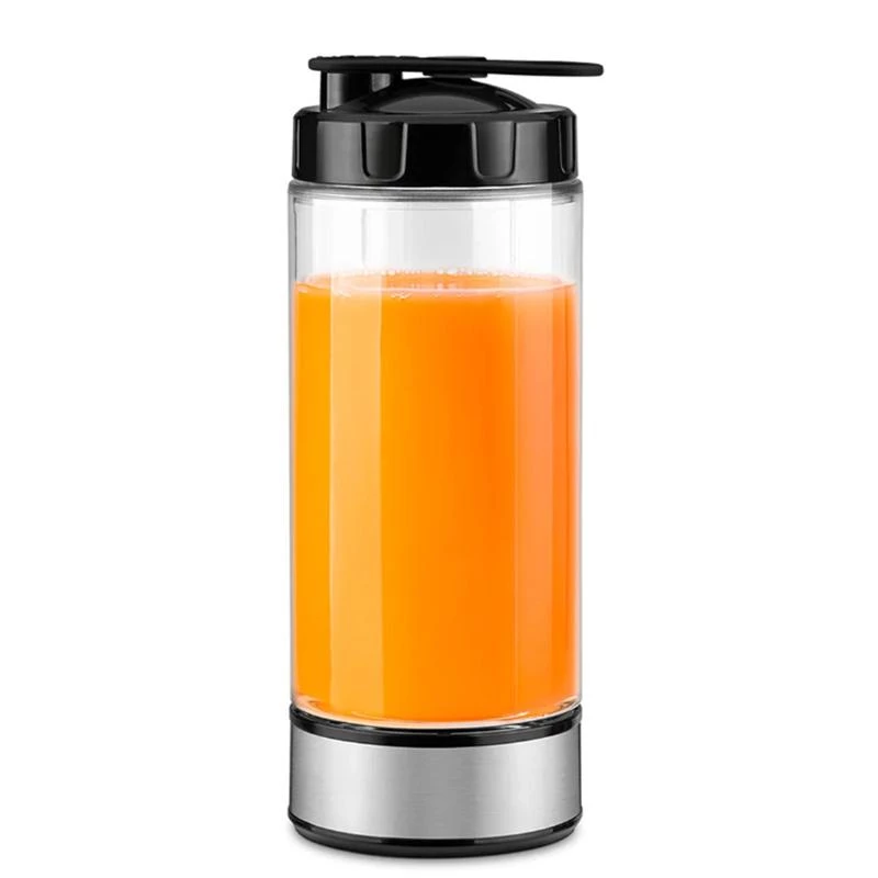 400 ml tritan glass 2 batteries of 2550 mAh 16500 rpm/min 6 stainless steel blades Automatic stop after 45 seconds Safety lock system Up to 20 uses per charge Stainless steel body USB charging Sport lid